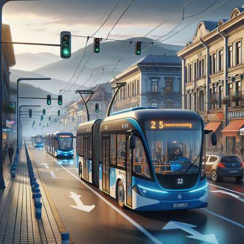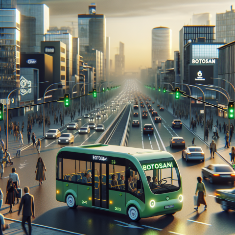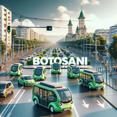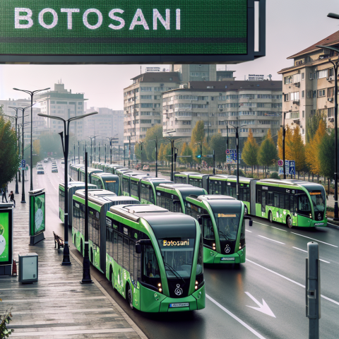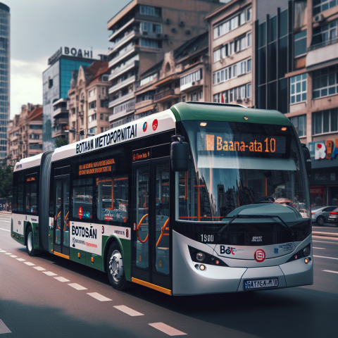 Transportul public local în zona metropolitana Botosani cu autobuze electrice marca KARSAN e-ATA 10 pe fata autobuzului. Cu text pe semn de circulatie: Zona Metropolitană Botoșani ">