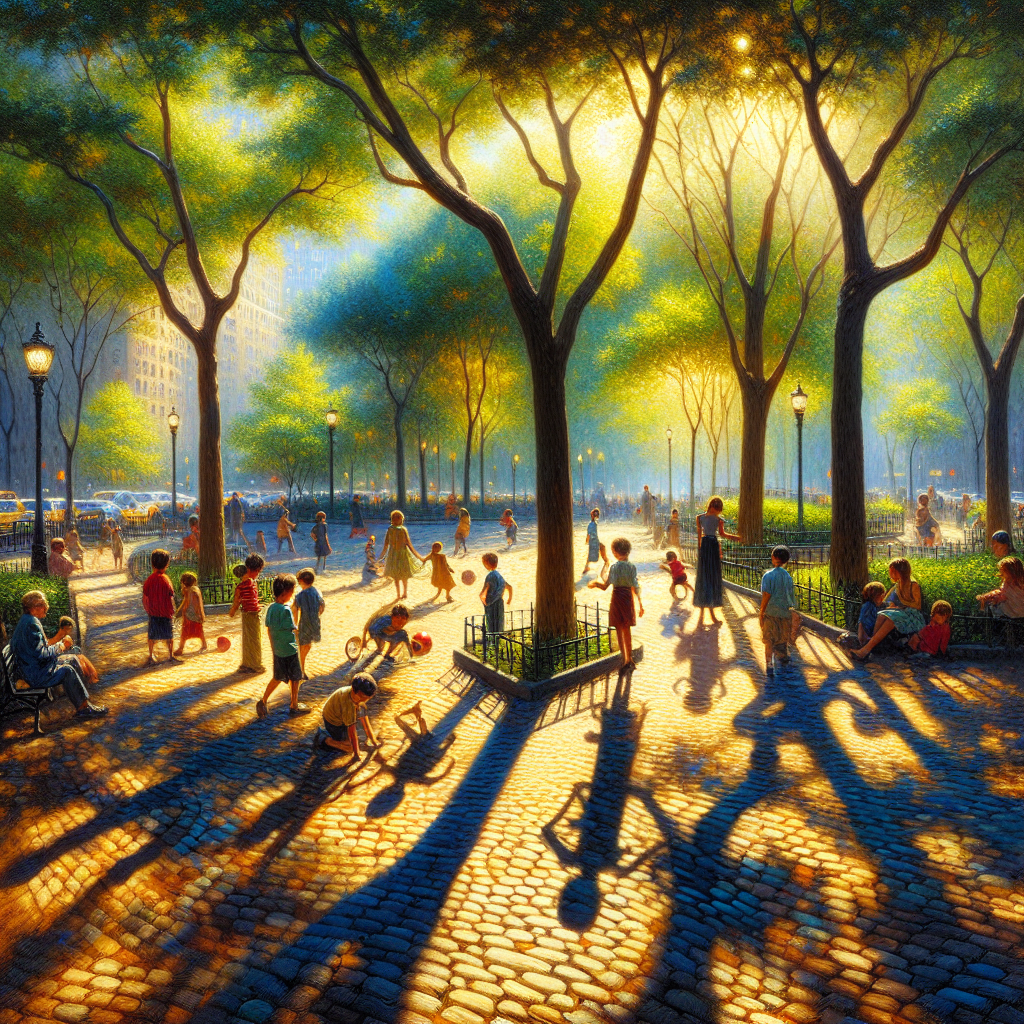 By photo, 13 April, 2024 Prompt An impressionist city park scene on a sunny day with dappled shade and children playing