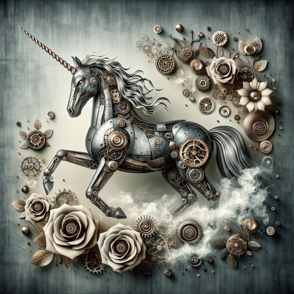 a steampunk unicorn, roses and flowers, gears