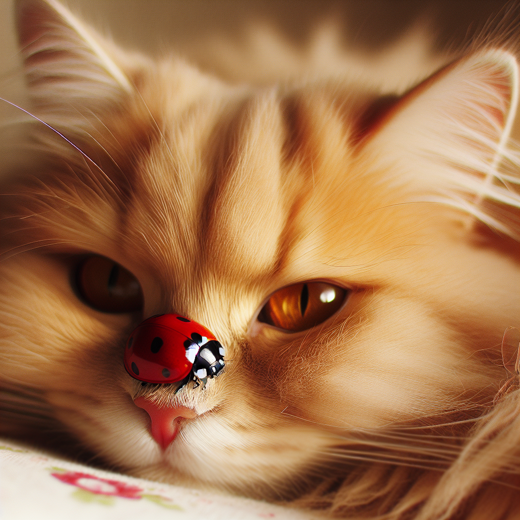 an orange cat with ladybug on nose