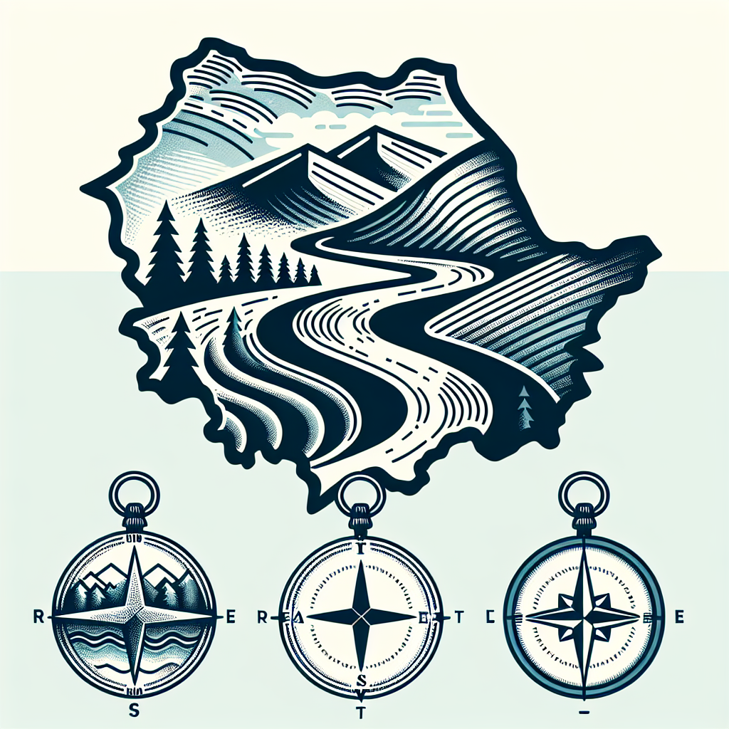 Using the shape on the map of Romania, form a logo in as much detail as possible, for a mountain group containing a Compass that can go outside the logo on the right side, a mountain with a path and fir trees. All these should be in colors.