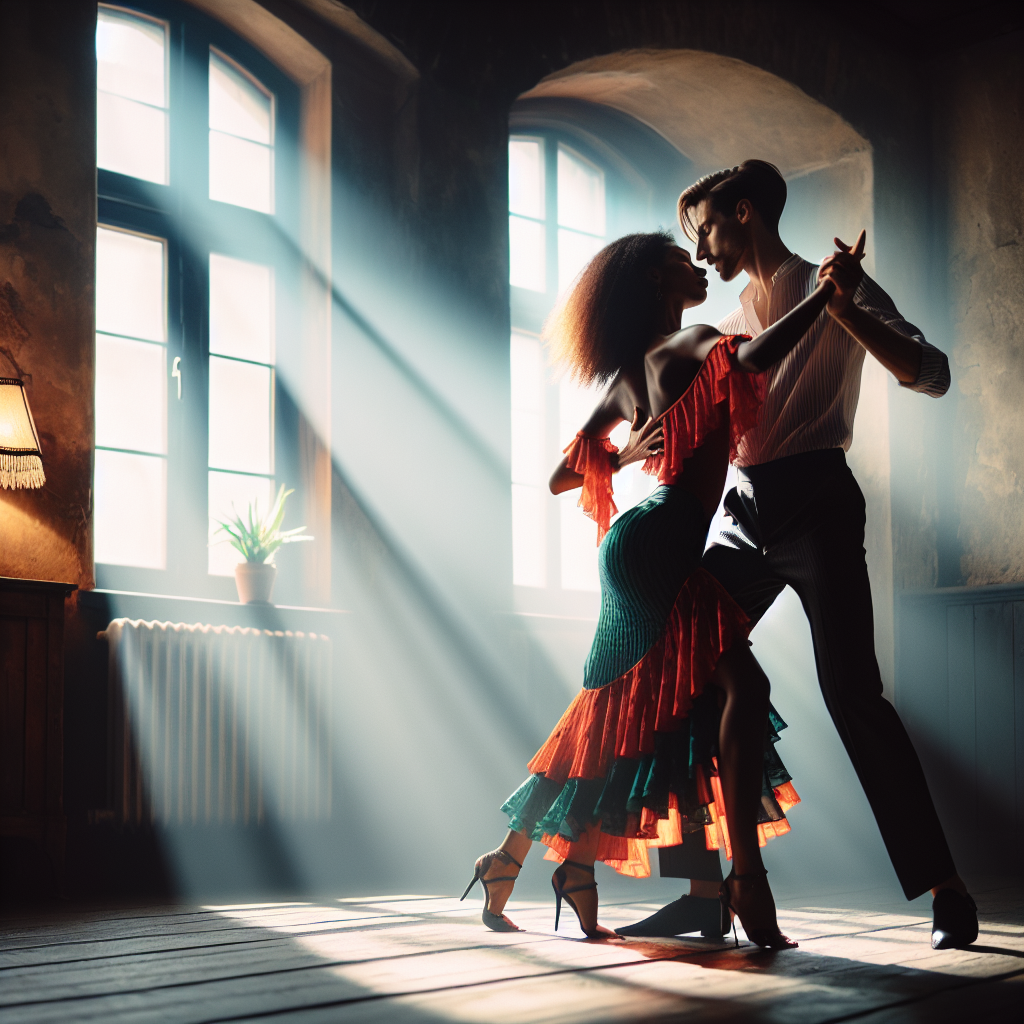 By photo, 9 June, 2024 Prompt 2 kizomba dancers in a darker room and a ray of sunshine dancing kizomba