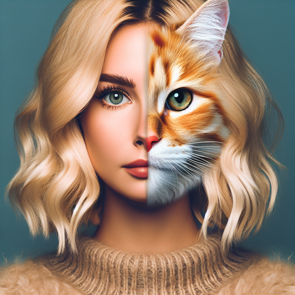 jumatata fata de fata blonda si jumatate de pisica portocalie